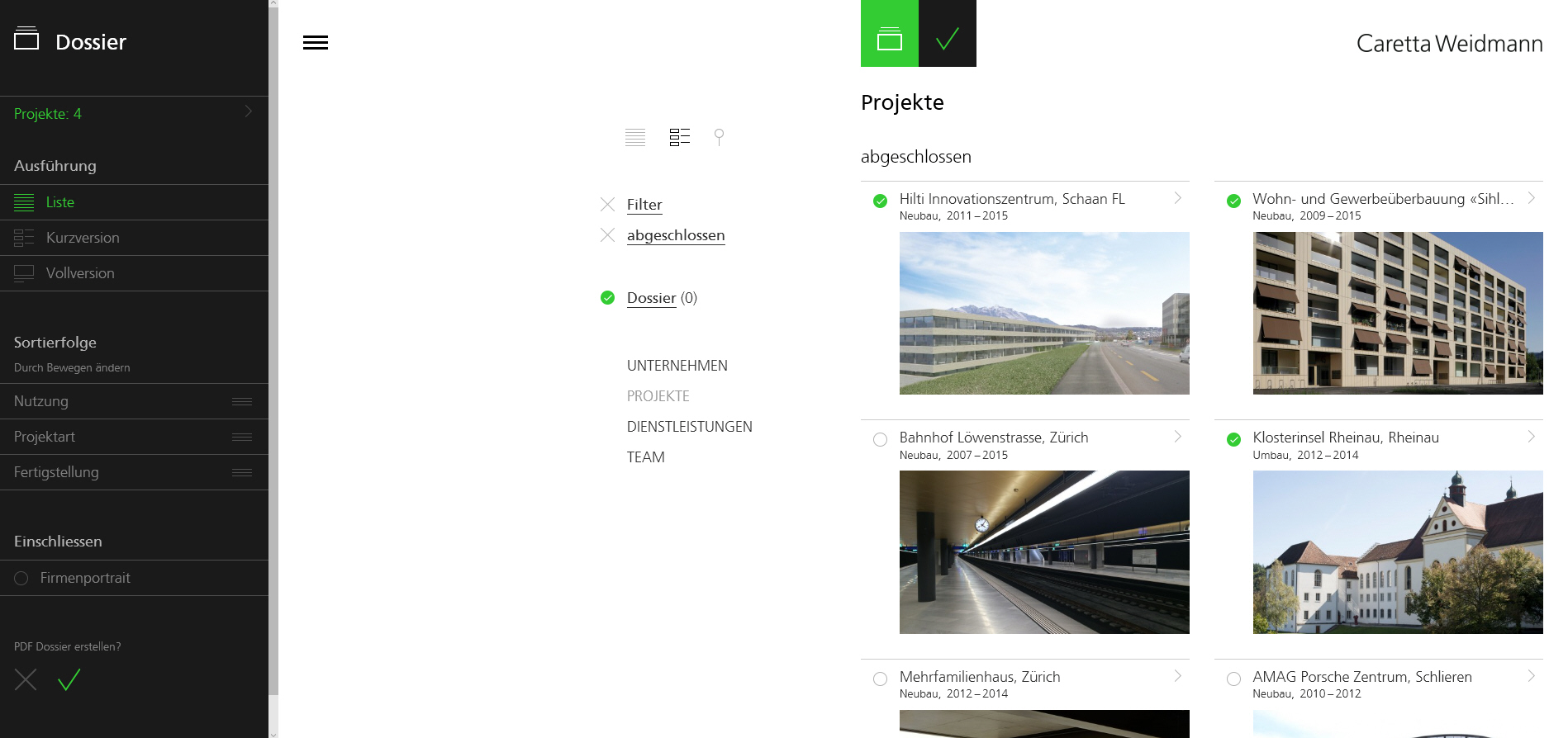 Einen grossen Mehrwert für die Nutzer/innen bildet der Dossier-Modus. In diesem Modus können Projekte frei zusammengestellt, nach bestimmten Kriterien sortiert und als PDF Dokument gespeichert oder ausgedruckt werden. Die Benutzerführung ist dabei immer klar und eindeutig.