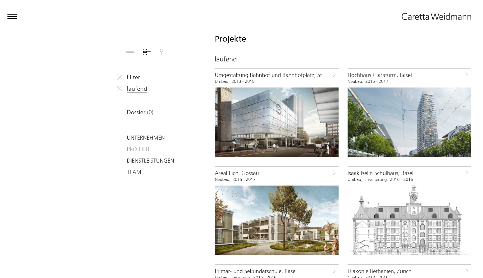 Caretta-Weidmann ist eine der führenden Baumanagement Unternehmen der Schweiz. Mit grossen und grosszügigen Projektbildern werden auf der Einstiegsseite Referenzprojekte vorgestellt. Die Navigation versteckt sich hinter dem bekannten und auf allen Geräten akzeptierten Navigations-Icon.