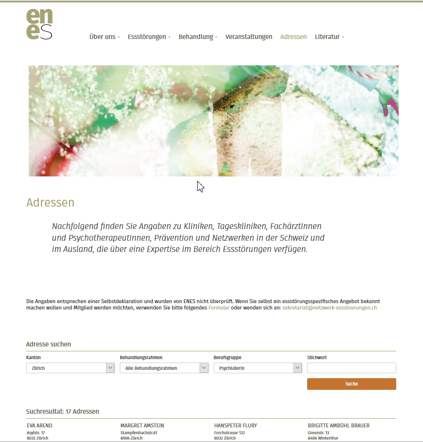 ENES engagiert sich aktiv für die Sensibilisierung gegenüber Essstörungen, deren Prävention und Früherkennung sowie für die Verbesserung der Behandlungsqualität in einem fachlichen und gesundheitspolitischen Kontext. Dazu werden eigene und thematisch nahe Veranstaltungen mit entsprechenden Anmeldemöglichkeiten über das CMS administriert und aufgeschaltet. Ein weiterer inhaltlich zentraler Punkt ist die Adressdatenbank: über verschiedene Filter (Lage, Behandlung, Beruf) können aus einem breit gestreuten Feld Spezialisten/innen gefunden werden.