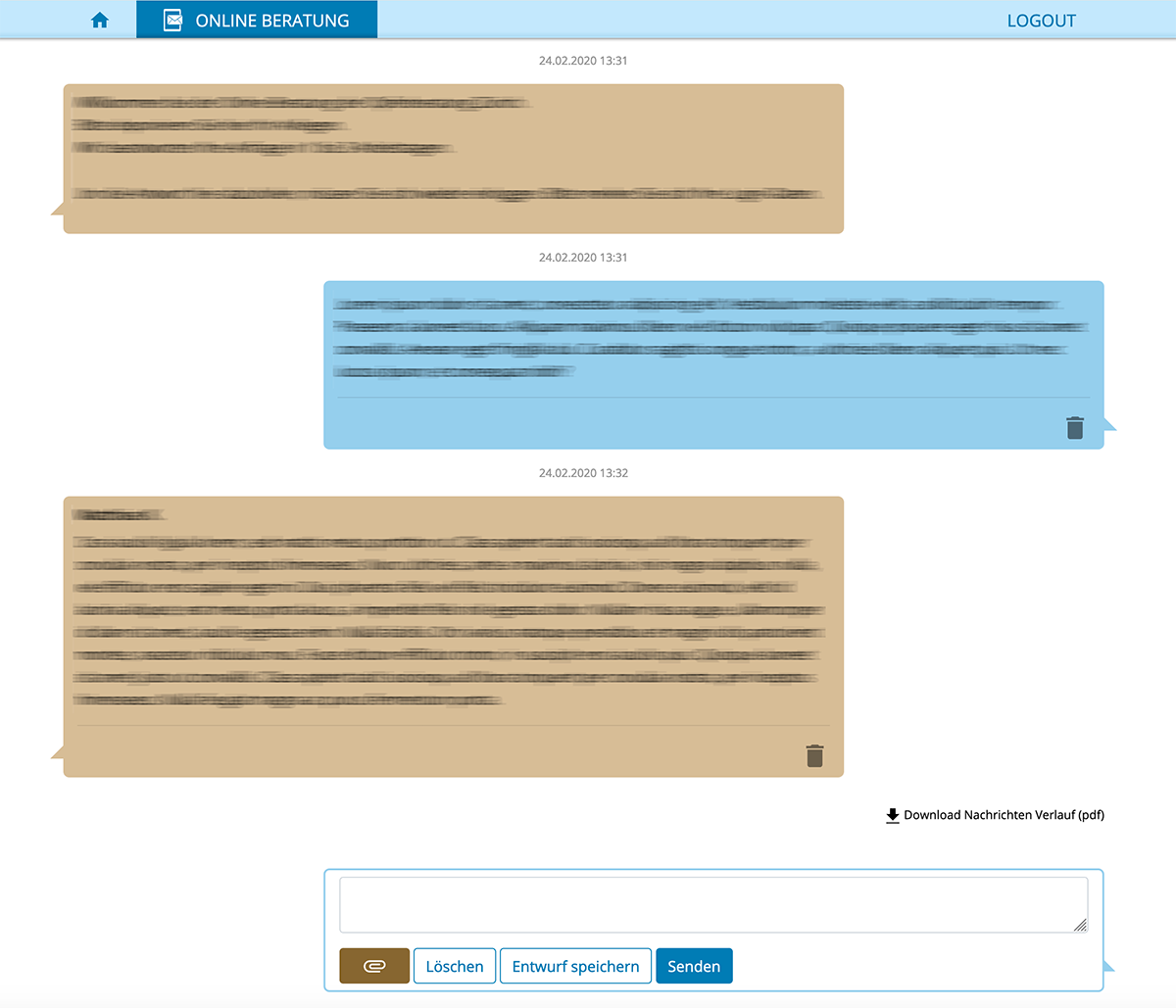 Diese Applikation basiert auf dem init CMS und wurde mit spezifischen Funktionen erweitert. Im Backend werden neue Anfragen den Beraterinnen zugewiesen, Nachrichten beantwortet und Statistiken erstellt. Sowohl für den Berater als auch für den Kunden steht ein Export des gesamten Verlauf inklusive Dokumente welche hochgeladen wurden zur Verfügung.